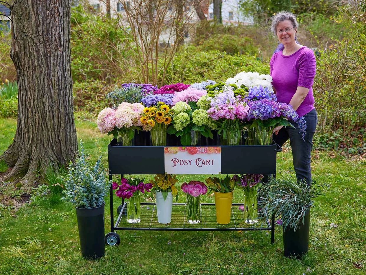 Here is our beautiful Posy Cart with a large selection of fresh flowers. We have focal flowers, filler flowers, and greens.